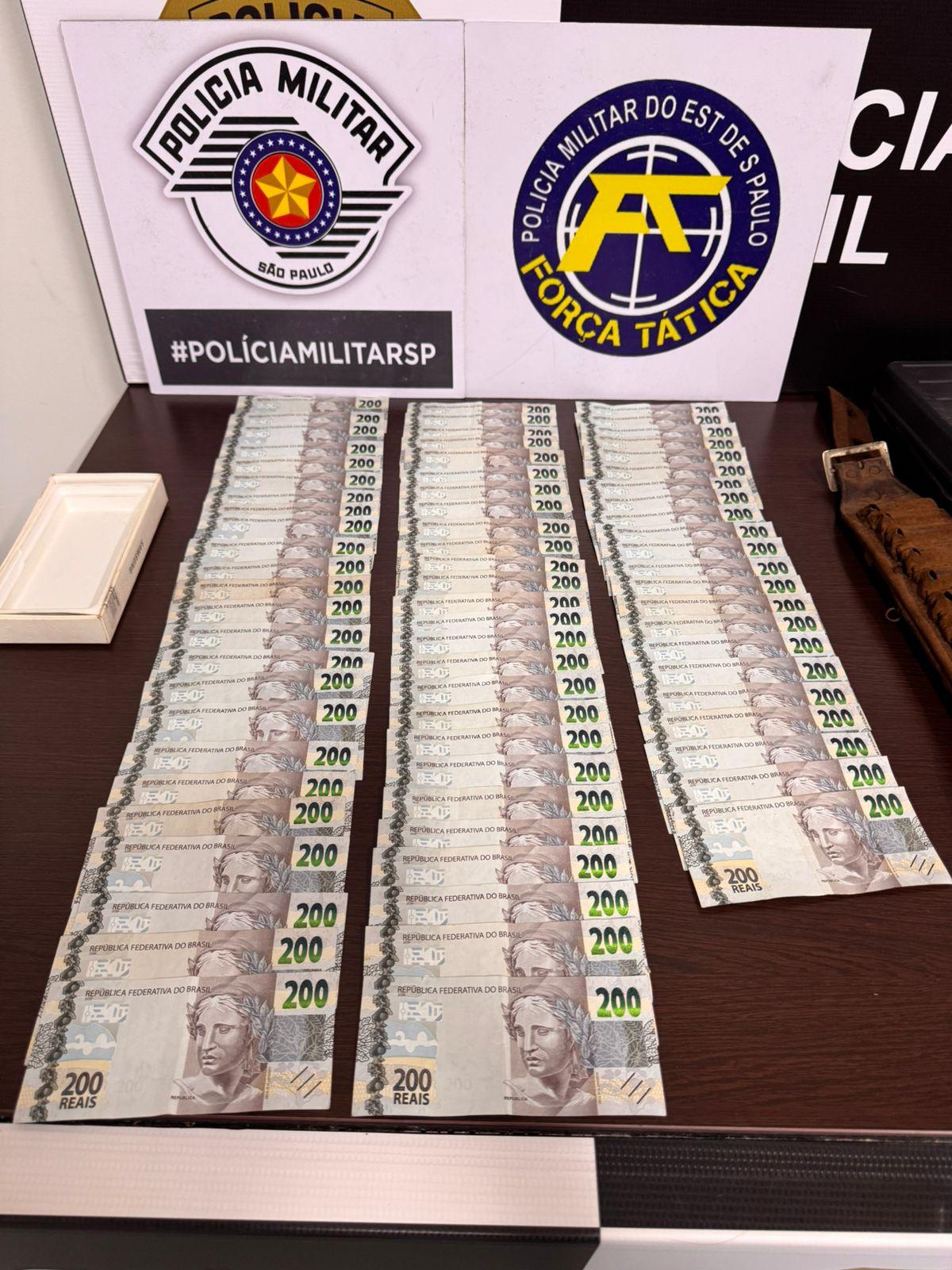 Já dentro da residência, os policiais encontraram dinheiro em espécie. Em uma gaveta de cômoda foram localizados R$ 2.230, enquanto dentro de uma caixa sobre o guarda-roupas havia R$ 14.400 em notas de R$ 200, totalizando R$ 16.630.